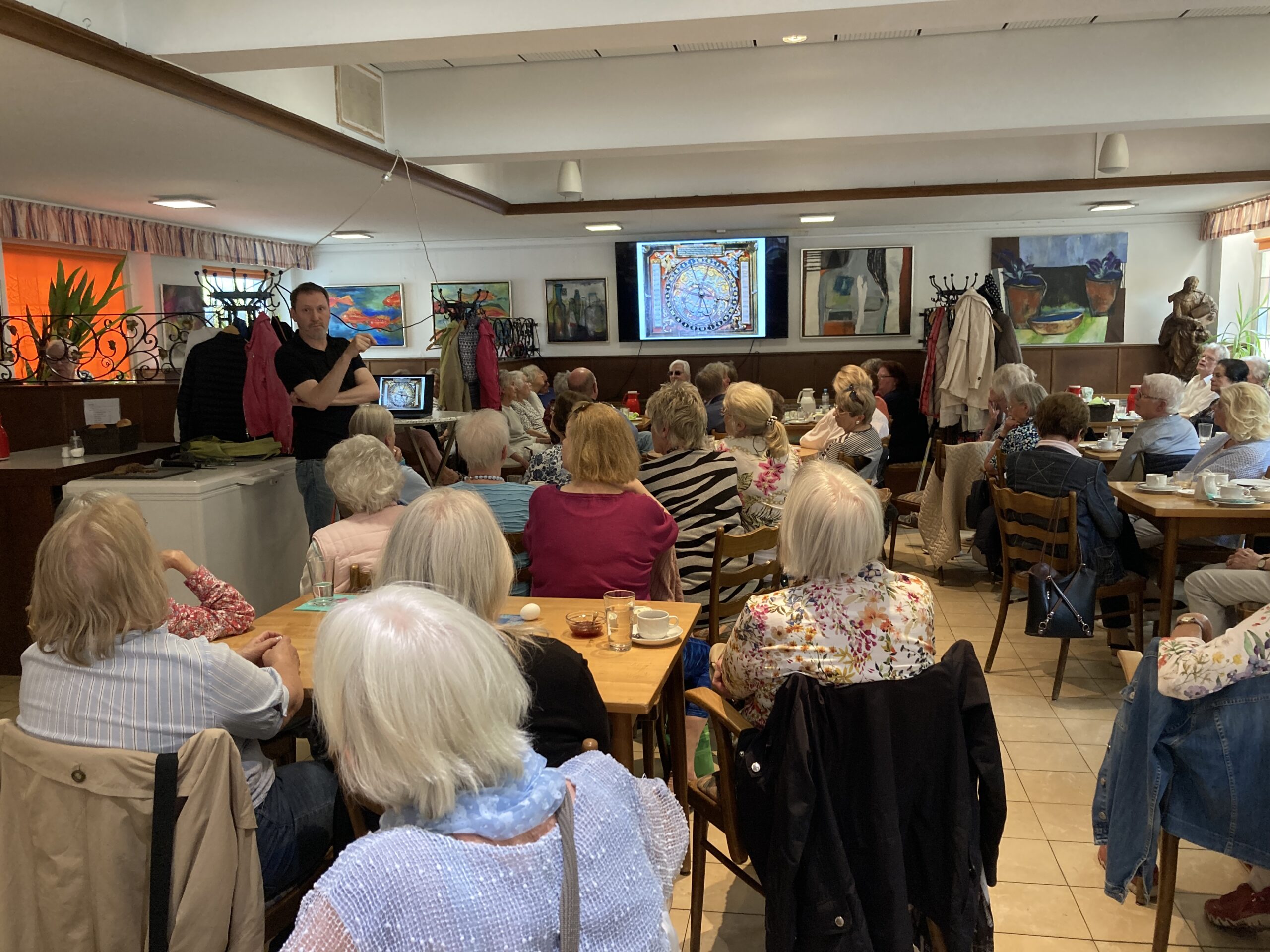 Homann vertrat mit seinem Vortrag den Auktionator Daniel Meyer. Der versierte Stadtführer kam mit seiner offenen Art sofort bei den rund 100 Zuhörern an und schilderte einige Besonderheiten von Münster. Schwerpunkt war aber die Geschichte der weltberühmten astronomischen Uhr und seiner Hersteller Dietrich Tzwyvel, Johann van Aachen und Nikolaus Windemaker.